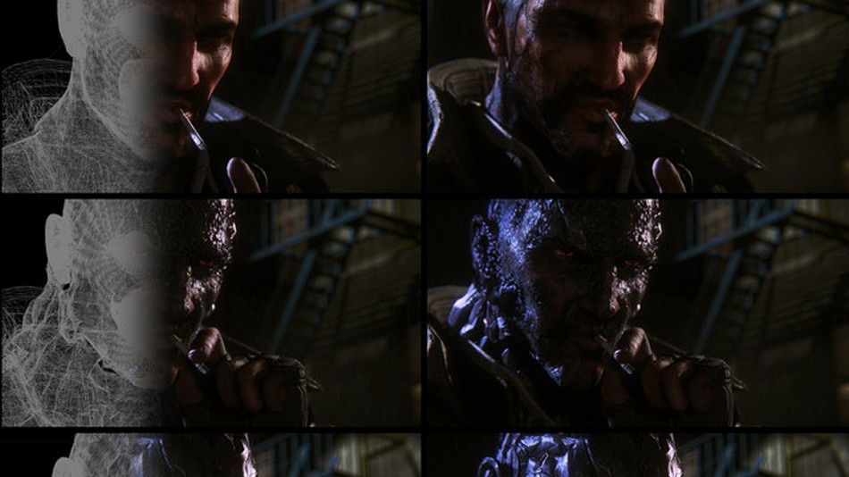 Next up, we were introduced to a trench coat-clad, cigarette smoking man who was attempting to break a chain with a welding tool. Shades of Deus Ex? You don’t know the half of it. While the man did his presumably dirty deed, we were given a close up on his face, which was coated in tiny rivulets of rain. The man himself was expressive, his face subtly shifting and cringing as he focused on his work. Meanwhile, light from the welder reflected on his face, dancing about as the flame sparked and sizzled.