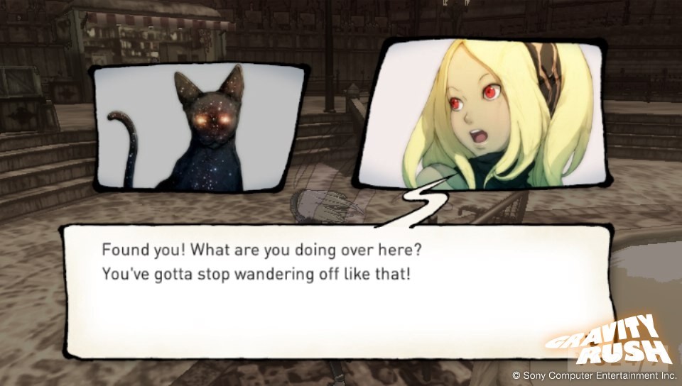We’re interrupted by some red creaures that start invading the game-world, introducing us to Gravity Rush’s combat system. On the ground, your typical kick is a mere square push, but when using gravity, combined with the Sixaxis aiming, it’s a unique take on the usual fighting. It shows part of Vita’s potential.