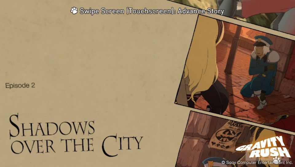 We see a woman flying through the air using the same skills given to Kat by the cat. After various rushes of gravity, we see a cut-scene, in which we’re introduced to this person, a black- and red-haired woman with what appears to be a crow on her shoulder. She takes off before we rescue a cop being ganged. He explains his story in a comic book reel, which can be manipulated through the Sixaxis controls and flicked through using the touch-screen.