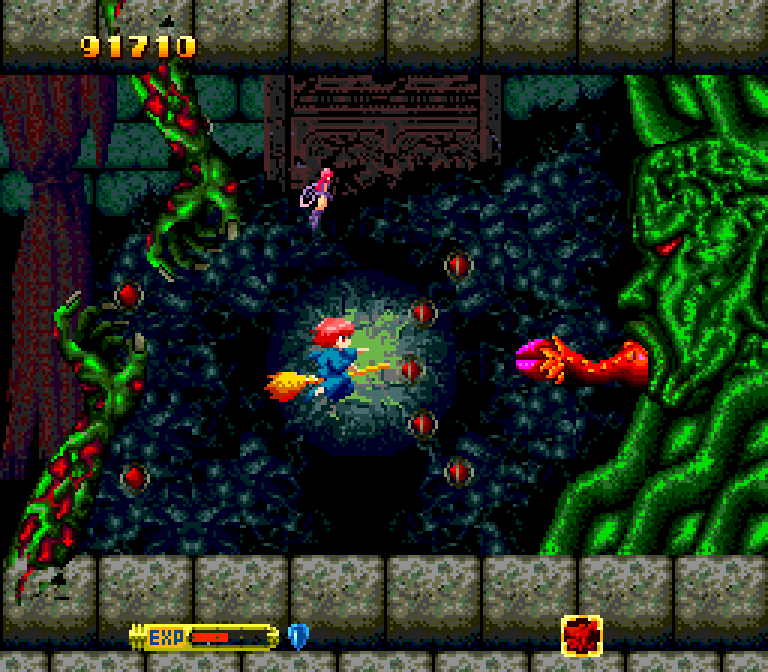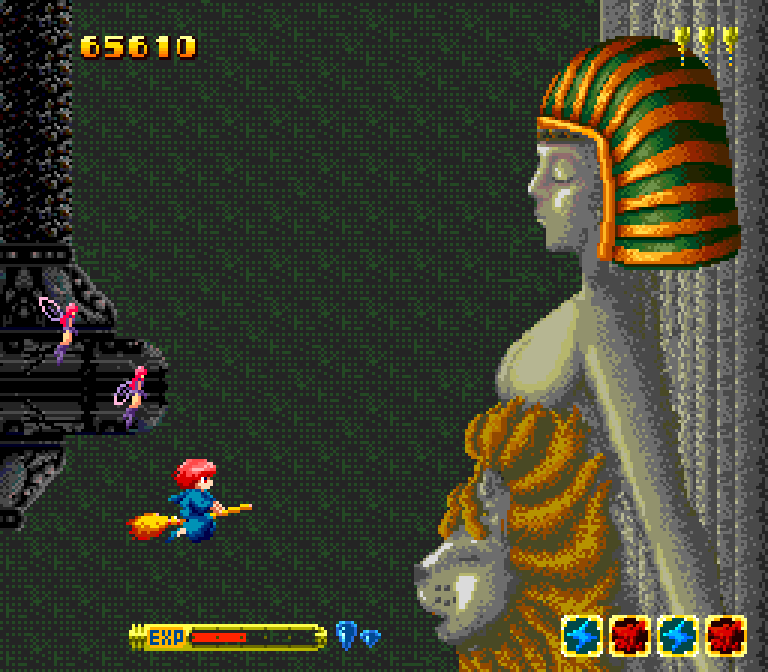 Perhaps publisher Hudson was banking on sex appeal to sell the game. While there's nothing at all sexy about the titular protagonist, Cotton -- a childlike witch whose mop of pink hair suggests her name refers to cotton candy rather than the so-called "fabric of our lives" (TM) -- her faerie companion Silk features prominently on the box art, clad only in a revealing purple bikini. Of course, in-game, there's hilariously little of that to be seen; outside of the obligatory anime-style cut scenes, Cotton reduces its characters to chubby little sprites fighting against ridiculous-looking fantasy monsters, raging pumpkins, dopey-looking fish-men and so forth. Cotton isn't much larger on-screen than your typical tiny spaceship, and Silk -- playing the Option to Cotton's Vic Viper -- flutters around as little more than an abstract smudge.