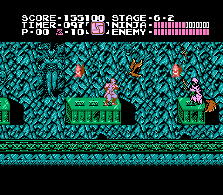 In hindsight, yeah, Ninja Gaiden's story is pretty hokey, and the tiresome mansplaining of the plot prior to the beginning of stage 4-1 dragged on even back then. But you can't fault the game for its sharp aesthetic appeal, with dramatic camera angles and just enough animation to make static images feel lively and energetic. And, in true Castlevania style, the scenery reflected the story being presented: American Ninja protagonist Ryu Hayabusa went from being assaulted in a back alley to escaping a secret military installation to forging through the jungle and a system of mysterious caverns to take the fight to an ancient temple where Evil Awaited.