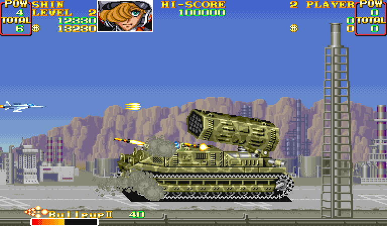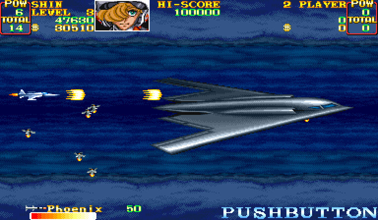 In many ways, U.N. Squadron felt like a variant on its sibling shooter 1943: The Battle of Midway turned sideways. Despite the difference in play style -- horizontal versus vertical -- it used a lot of the same tricks as its more popular counterpart. One-hit kills and multiple lives were deprecated in favor of a single red-gradiated life bar per credit, allowing a somewhat more generous (but nevertheless far from toothless) difficulty level than, say, Gradius or R-Type. It also allowed for two-person cooperative play, at least in the arcade.