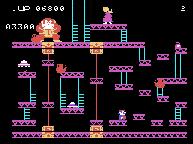 Obviously, I know now Donkey Kong has always been a clownish, lovable doof, but take a look at his Colecovision rendition. DK's eyes are two beady pixels on a deathly white face that's slashed with a deep scowl. There's no opening animation, nor are there any cinemas between levels. Aside from jerkily throwing barrels in the first level, Donkey Kong doesn't move - and if you touch him, you die. Even looking at Coleco DK now, years later, he still comes off as sinister.