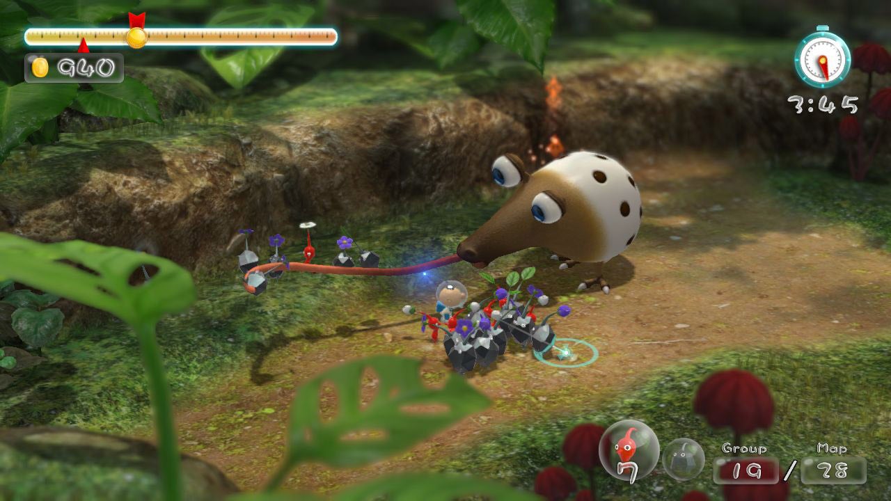 Pikmin 3's take on nature is nature red in tooth and claw; it feels like the proper order of things for your walking vegetable men to fight back against the predation of the world's roaming monsters. The titular pikmin are inch-high creatures, strange plant-animal hybrids, and they make a perfect snack for the animals living in Pangaea's ruins. Giant bugs can crunch them. Birds can gulp a dozen of them with a single scoop of their beak. Larger creatures barely even acknowledge the pikmins' presence, crushing your precious helpers almost by accident as they stomp around. Simply traveling from place to place represents harrowing danger, simply because that's how nature works.