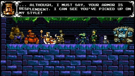 Shield Knight, of course, is absent for most of the game, but she's never far from Shovel Knight's mind. In our review back in June, I wrote: "What really surprised me though was how emotional Shovel Knight could be, which was definitely not something I was expecting from an 8-bit platformer. In one of its best sequences, Shovel Knight finds himself dreaming of his lost love—the Proto Man-like Shield Knight—by the campfire; and in his dream, you are implored to "Catch Shield Knight!" as you hack away at a host of enemies. Inevitably, there is a flash of light just as you're about to catch her and it's morning again, at which point Shovel Knight wordlessly trudges off to take on another member of the Order of No Quarter. It's a moment that reflects the medium's continued trend toward expressing emotion through gameplay, and its one that I have to say that I really like. I just wasn't expecting to find it in a retro platformer like Shovel Knight."