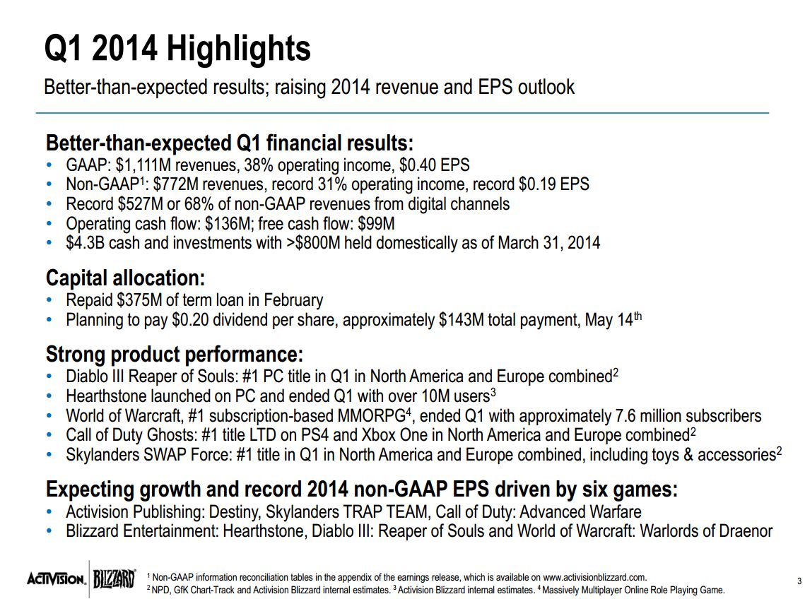 “Our better-than-expected performance was driven by record digital sales in Blizzard Entertainment’s franchises, including World of Warcraft, Diablo, and Hearthstone: Heroes of Warcraft which has more than 10 million registered users as of its March 11 launch on Windows and Mac, in addition to Activision Publishing’s Skylanders and Call of Duty franchises," said Activision CEO Bobby Kotick in a prepared statement.