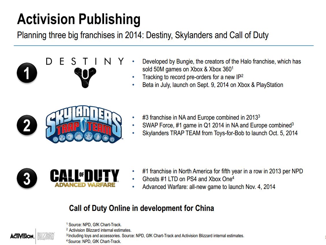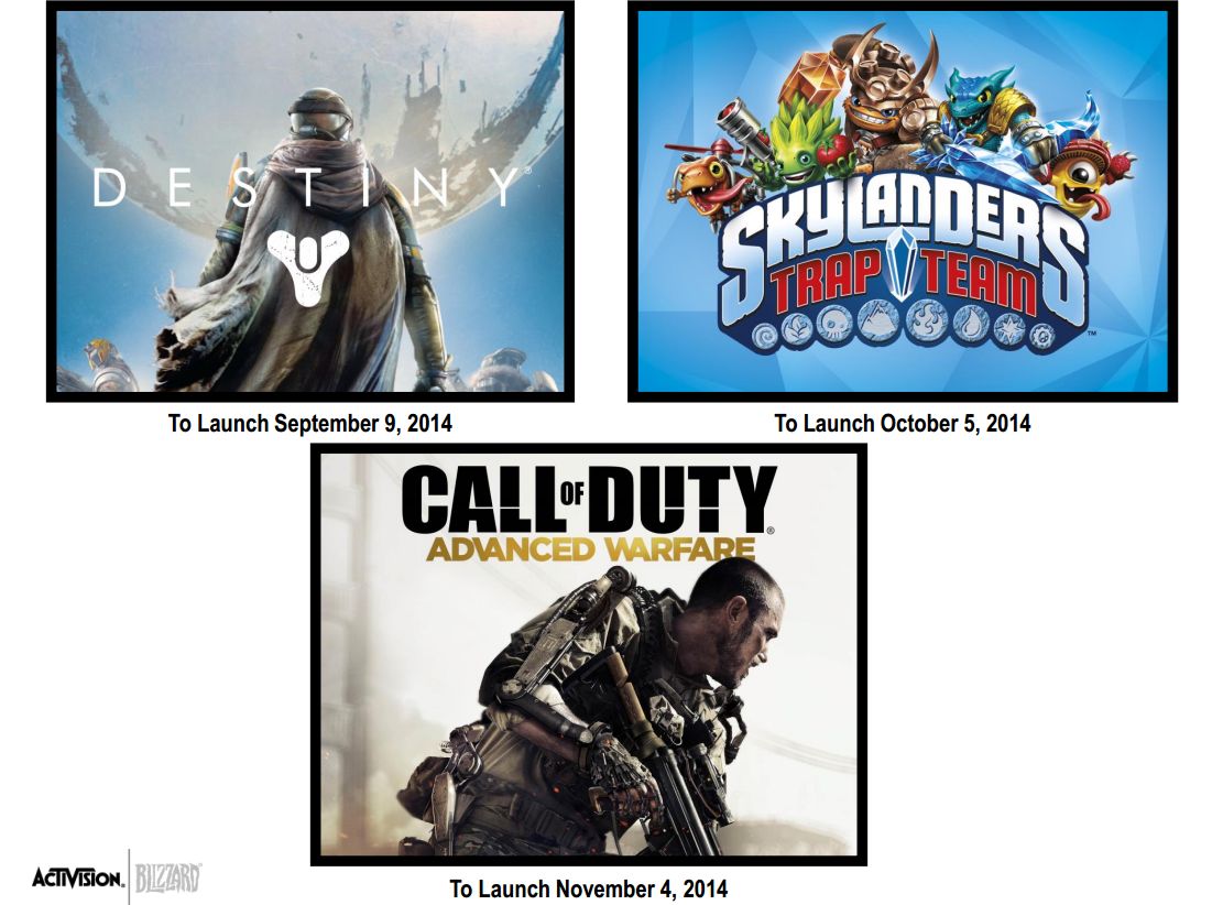 “We have a strong product pipeline for the balance of the year, beginning with the September 9 the planned launch of Destiny, which we believe could become our next billion dollar franchise and the largest new videogame IP launch in history. Skylanders: Trap Team and Call of Duty: Advanced Warfare are expected to be released on October 5 and November 4, respectively.