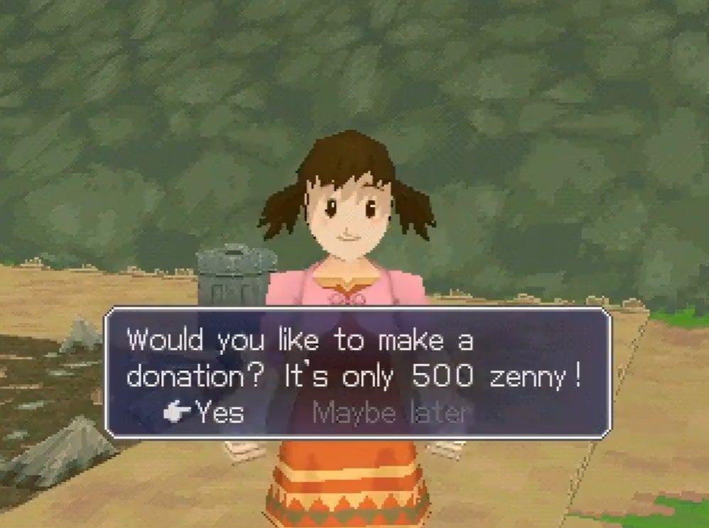 Another example of Legends 2's ambition is its surprisingly deep morality system. While you can act like a jerk in Mega Man Legends and have your armor darken to black if you vandalize vending machines (like I did), the consequences of being a dick are much more significant in Mega Man Legends 2. Once you don the black armor—easy to do if you go around kicking pigs—townspeople regard you with suspicion and merchants raise their prices. If you act badly enough, you'll break the heart of Roll, Mega Man's adoptive sister, to the point that she loses motivation and raises her prices for weapon upgrades.
