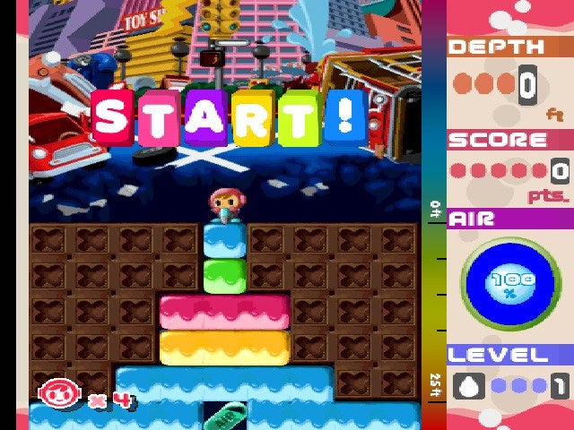 The round, smiling face of the titular Mr Driller betrays his dangerous mission. As the son of arcade superstar Dig-Dug, you're tasked with plunging underground and drilling away the colored blocks bubbling up from the depths. Four (or more) blocks of the same color will disappear when they collide with each other, which helps prevent you from suffering an unfortunate Death by Squishing. Just make sure to grab the air tanks scattered in each level, or you'll suffocate instead. Hooray! What a horrifying, adorable, maddeningly addictive puzzle game! —Nadia Oxford