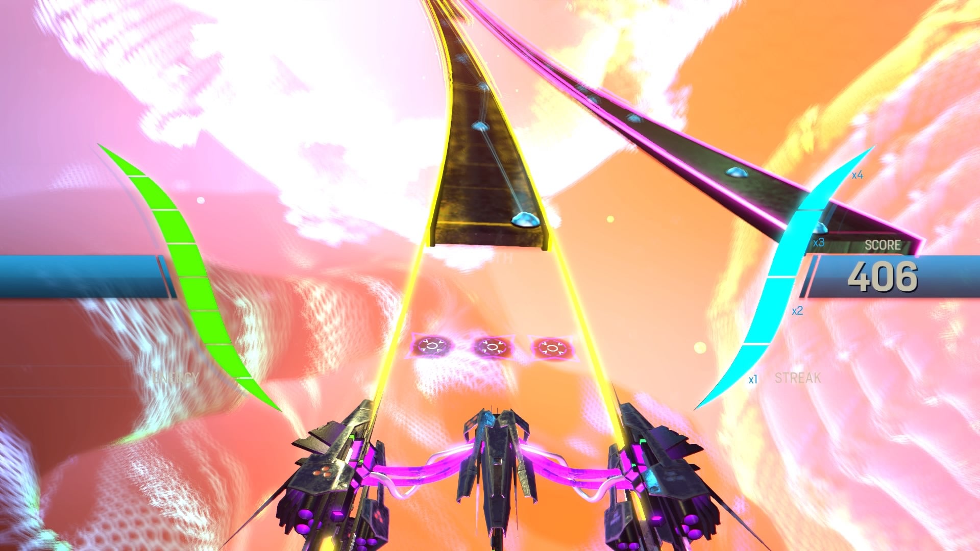 Backing up the quality gameplay are suitably abstract and psychedelic background graphics. While they don't impinge on the clearly-rendered note highways, they're nevertheless bright and colorful and really give the game its own unique style that matches the action and soundtrack very well indeed.