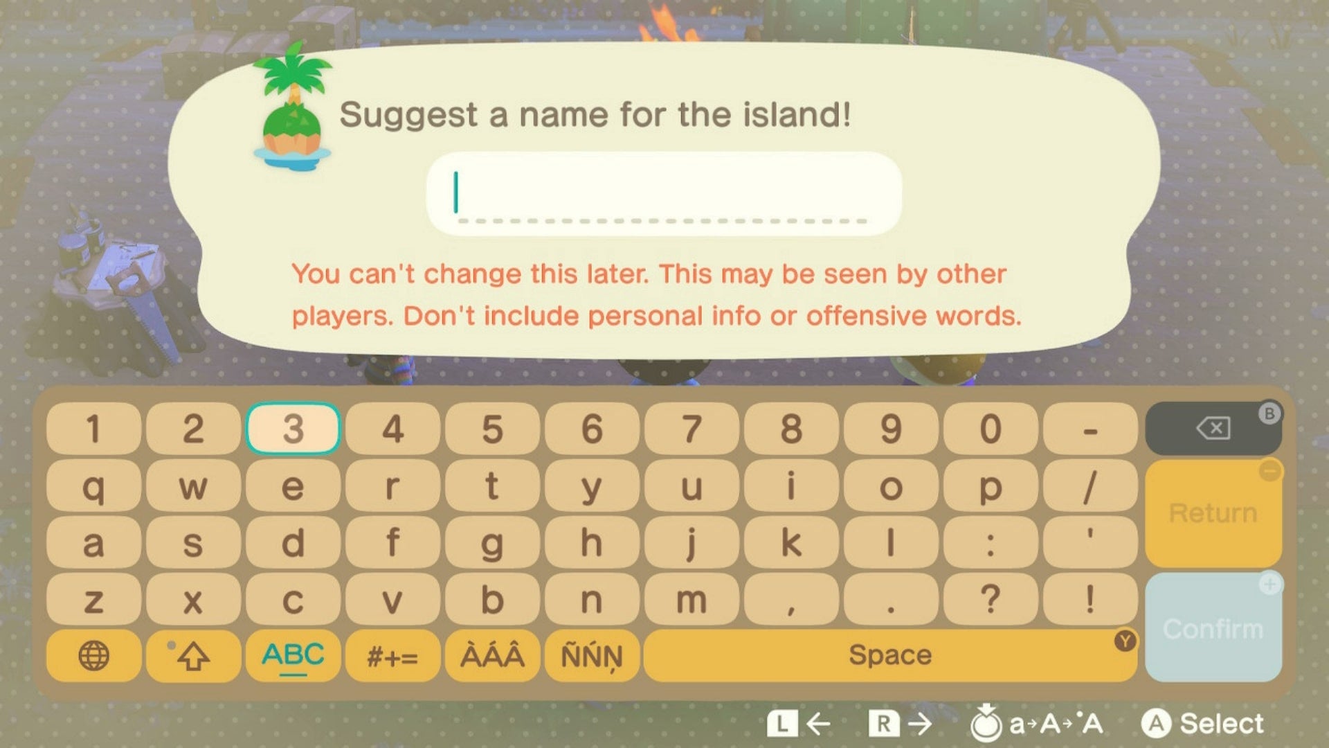 Naming your island/village has always been an important part of the Animal Crossing series. Ultimately, it's up to you to choose a name, though there are some rules. The main one is that you cannot put anything in that could be considered profanity, this is a children's game after all.