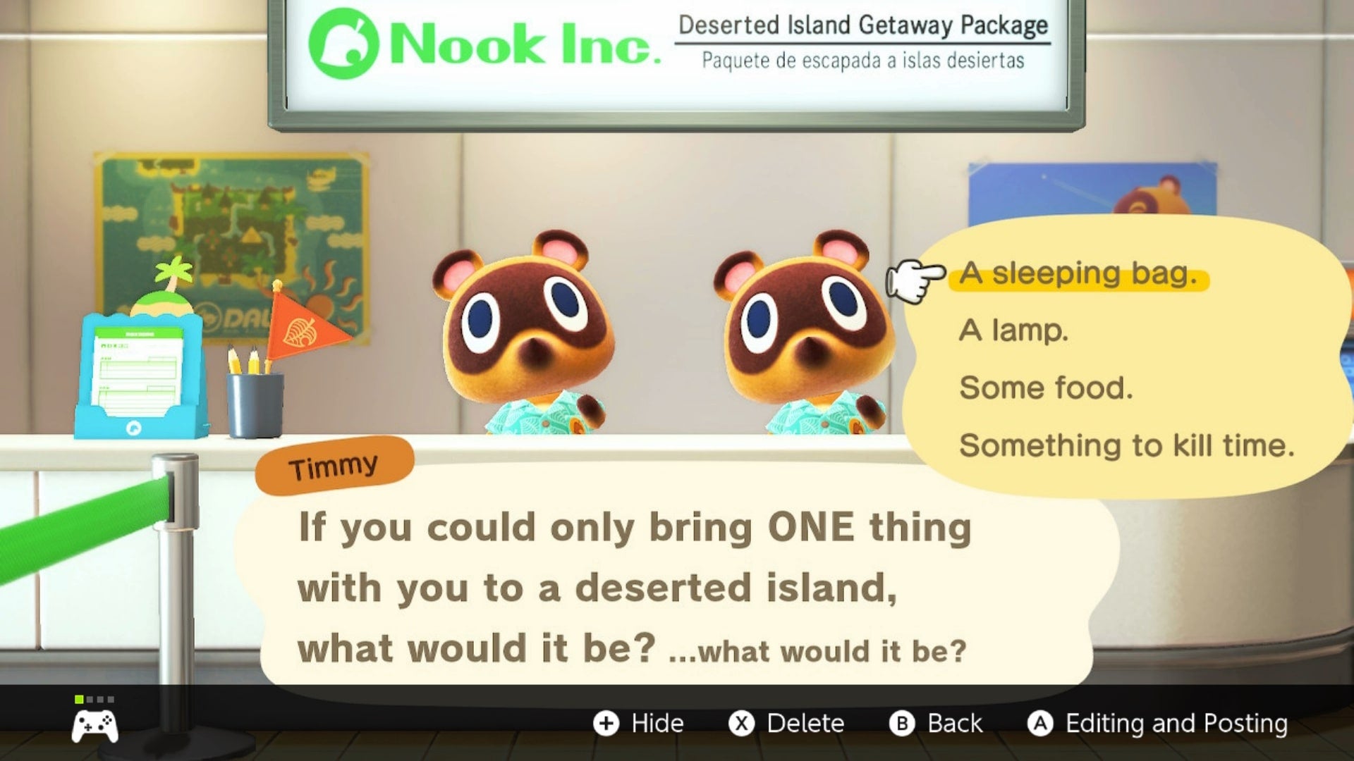 Don't worry about which one you pick, as Tom Nook later explains that the question is completely rhetorical. It's a joke of sorts, as you'll be receiving all four things courtesy of Nook Inc. once you arrive at the island. For more on the intro section of the game, head to this guide.