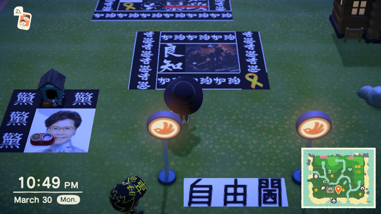 It's a quiet Monday night in the age of COVID-19, and I've just been invited to a stranger's Animal Crossing: New Horizons island to take photos of Hong Kong protest art. My host on Pikapika Island, v? (or "vice"), greets me in a black and yellow protest-themed custom outfit. Following the usual polite Animal Crossing etiquette, I drop a stack of my island's native fruit—pears—and he gives me a black privacy mask. "For you," he types in the game's chat feature. He tells me I'm free to run around and take pictures.