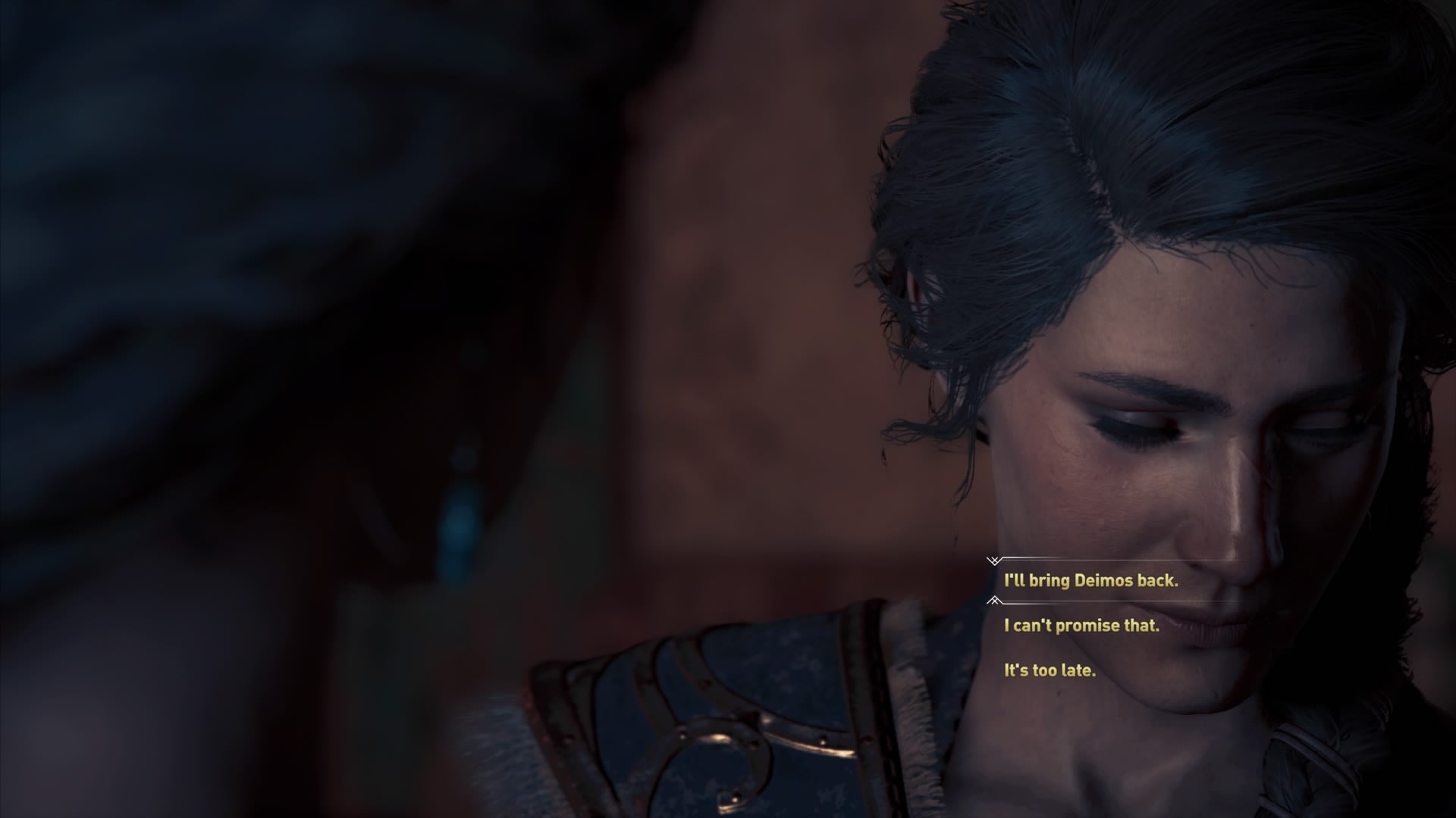 During this cutscene it’s very important that you say that you’ll bring Deimos back to Myrrine and Sparta if you’re going for the “best" ending. You have been warned.