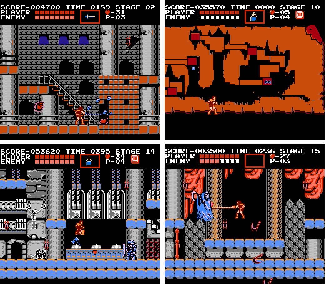 The comparatively slow pacing of Castlevania may simply have come about as a natural consequence of the game having been designed for NES rather than for the powerful arcade hardware on which Ghosts ’N Goblins originated, but Konami embraced that necessity and made its effects universal. As with the best action games, Castlevania gave the impression that its creators defined the hero's abilities and limitations first, then designed the quest and all its obstacles around those factors. Simon couldn't move quickly, and he couldn't jump very high or far; so, Konami built the game out of blocks that neatly matched up to his actions. Enemies moved in simple patterns and demonstrated small tells to allow you to predict their actions. Castlevania demanded almost pixel precision at times, but if you screwed up a jump or failed to hit a bad guy, you always knew it was your fault. Only a handful of enemies — namely the Flea Men, and Death's scythes — ran the risk of overwhelming Simon with unreasonable numbers, speed, and movements.