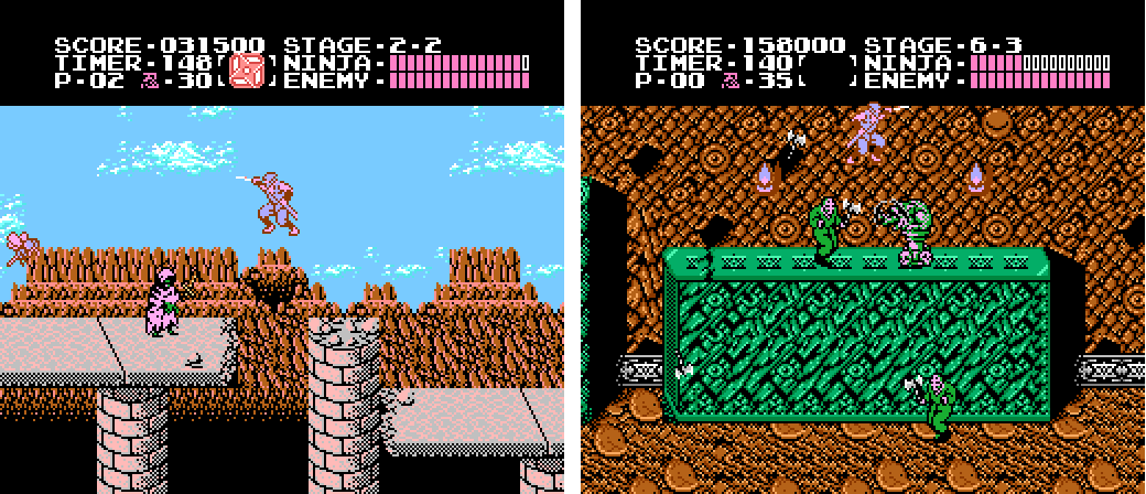 Ryu had modest jump power, like Simon's, and while he could alter his direction in mid-air to a certain degree he nevertheless was constrained by the need to commit to an action to a significant degree. Enemies in Ninja Gaiden appeared quickly, frequently, and without mercy, meaning that haphazard actions guaranteed failure. But, as in Castlevania, foes appeared at fixed locations and obeyed set rules. Learning the ins and outs of each level as well as its innate rhythms became the key to success — as in Castlevania. Playing the two games well ultimately felt much alike and demanded the same mental discipline, albeit at very different speeds.
