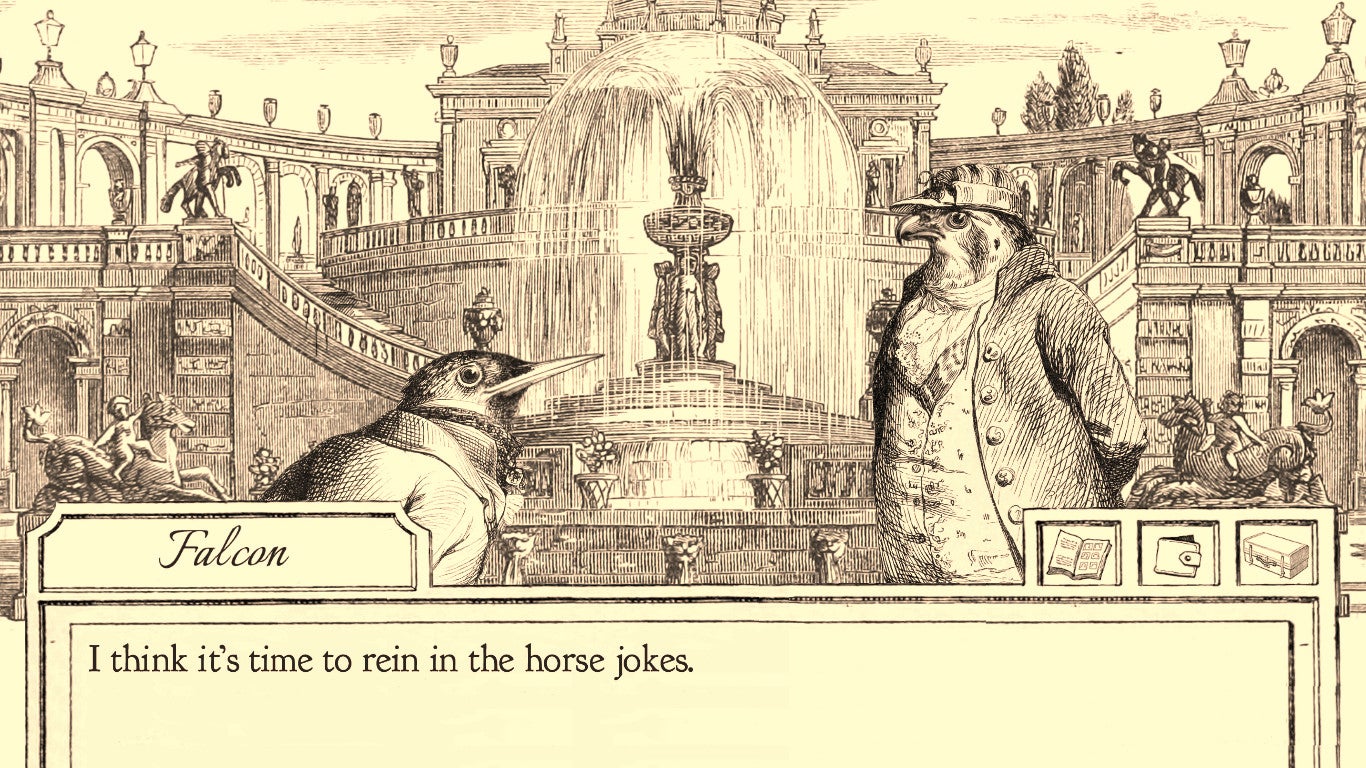 And it's a shame that Aviary Attorney closes its curtain so hastily, because it presents a world that's simply fun to live in. Strangely enough, Sketchy Logic cobbled their game together out of era-appropriate public domain assets, which comes off as charming and authentic rather than the effective shortcut it essentially is. While they don't animate particularly well, the intricate, delicate line work of J.J. Grandville's animal-people (combined with equally intricate backgrounds) is simply fun to stare at, while the music of Camille Saint-Saëns provides the perfect accompaniment to Aviary Attorney's setting of mid-19th century France. And even though the cast only touches upon their animal forms to make an endless string of puns and dad jokes, each character nonetheless has a distinct voice that's a joy to watch bounce off others during a heated conversation.
