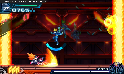 Much of the action strategy inherent in Gunvolt has to do with managing your electrical energy. This holds especially true for boss encounters, where you need to balance the tremendous amount of damage you need to inflict with the need to recharge during the short breaks in their attack patterns. There's another factor to manage as well: By default, Gunvolt comes equipped with an accessory that allows him to automatically dodge any attack provided he's not discharging electricity at the time. Against many of the game's more advanced foes, you're better off playing evasively rather than aggressively, attacking only between their powerful, screen-filling attacks.