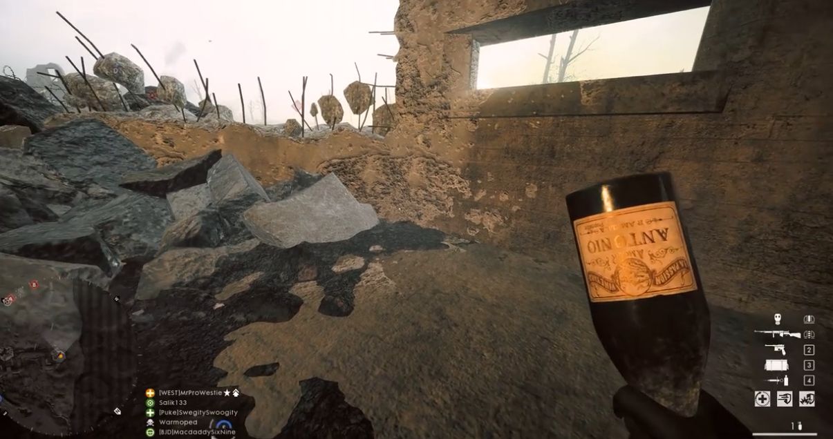 Finally, on Passchendaele, five bottles are found inside the B Flag bunker: three on the green box and two on the wooden box. Another is found inside the destroyed bunker closest to the out of combat zone between the D Flag and E Flag. The last one can be found in a small trench bunker closest to the E Flag.
