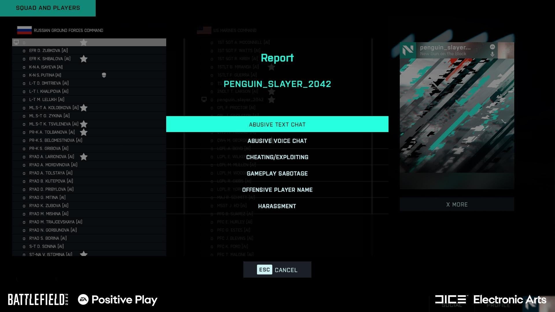 Speaking of which, Battlefield 2042 will be launching with a fairly well-featured reporting system, allowing all players to report a wide range of disruptive and undesirable behaviour straight from the game. You can report players for cheating/exploiting, offensive voice/text chat, inappropriate names, harassment, and even "gameplay sabotage."