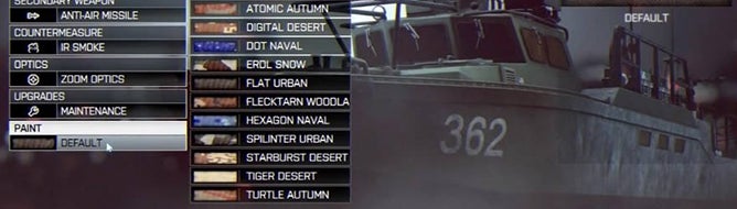 In addition to equipping your very own boat with lock-on anti-aircraft missiles and infrared defeating smoke, it can also be dressed up in 12 camouflage patterns, including "Starbust Desert" and my personal colours, "Turtle Autumn". I just know a giant turtle coloured boat wouldn't look out of place on the blue-orange battlefields of Battlefield.