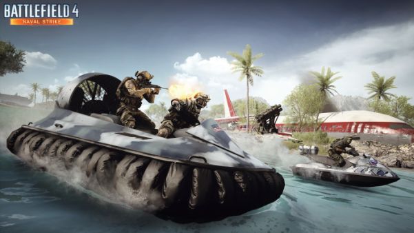 Battlefield 4 Naval Strike screenshots show boats, waverunners, a helicopter