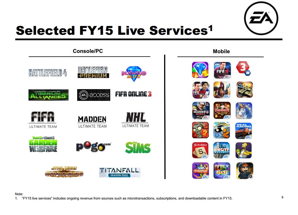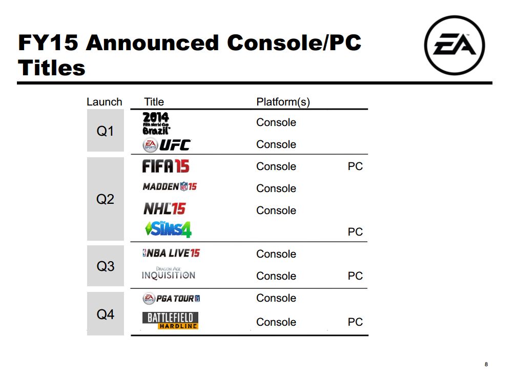 For the quarter ended September 30, 2014 EA said it was the number one publisher on PlayStation 4 and Xbox One consoles in the Western World, with FIFA 15, NHL 15, Madden NFL 15, EA Sports UFC, Titanfall, Battlefield 4 and FIFA 14 leading the way.
