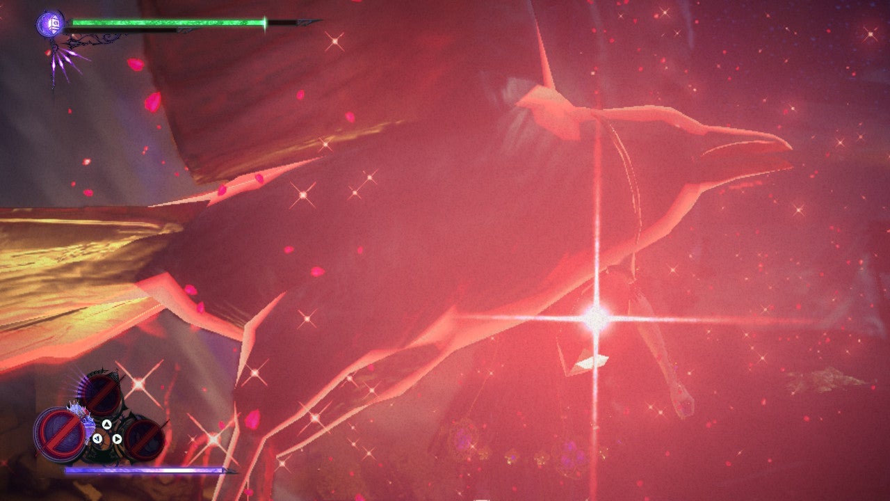 The first Umbran Tear of Blood you’ll find is the Crow. After the sequence with Cheshire where you’re digging for water, backtrack a little once you gain control of Viola to a small gap in the wall of rocks. It’ll lead you to an easy boss fight in Verse 6. After this, keep going – you should find a ledge on a cliffside that’ll take you to an area with the Crow. Finding it is the hard part; to catch it, you can approach from either direction and chase it down with your dash and wire jump.