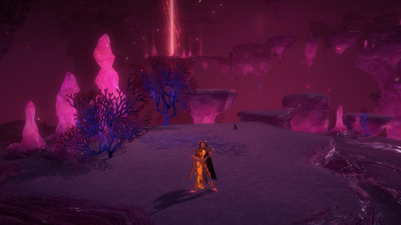 Your next target, the Crow, is further down into the level – you’ll start descending some huge, ancient Egyptian steps on a massive walkway. About halfway down, near Rodin’s shop, there’ll be an earthen platform under you, and the Crow is perched on it (the side facing the caves, not the cliffs). Drop down on it from above and chase it up the sandy slopes from the way you came – ideally with your spider summon – and you’ll be able to catch it in no time.