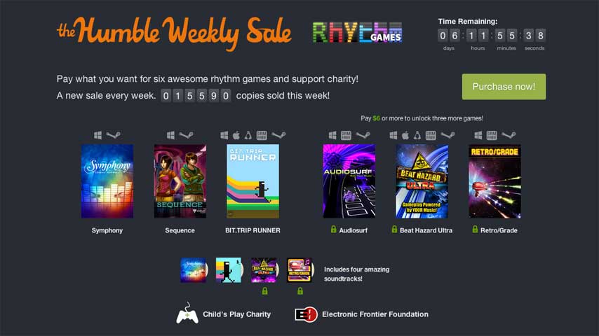 The latest Humble Weekly Sakle invites you to pay what you want for Gaijin Games' Bit.Trip Runner. If you cough up a measly $1, you'll also score Symphony and Sequence. Pony up a whole $6 - woah, big spender! - to score Beat Hazard Ultra and the excellent Audiosurf and Retro/Grade. Some DRM-free, Linux and Mac options are available, and soundtracks are included. As ever, your purchase price is split between developers, organisers and charity. This deal ends March 27 so get on it.