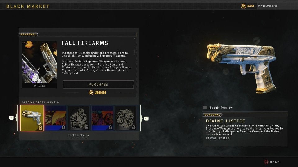 Not long after launch - once reviews landed, of course - Activision rolled out the Black Market, where players can purchase cosmetics and the like. In the latest patch, the Fall Firearms pack was added, which includes two weapon skins and a host of calling cards and tags.