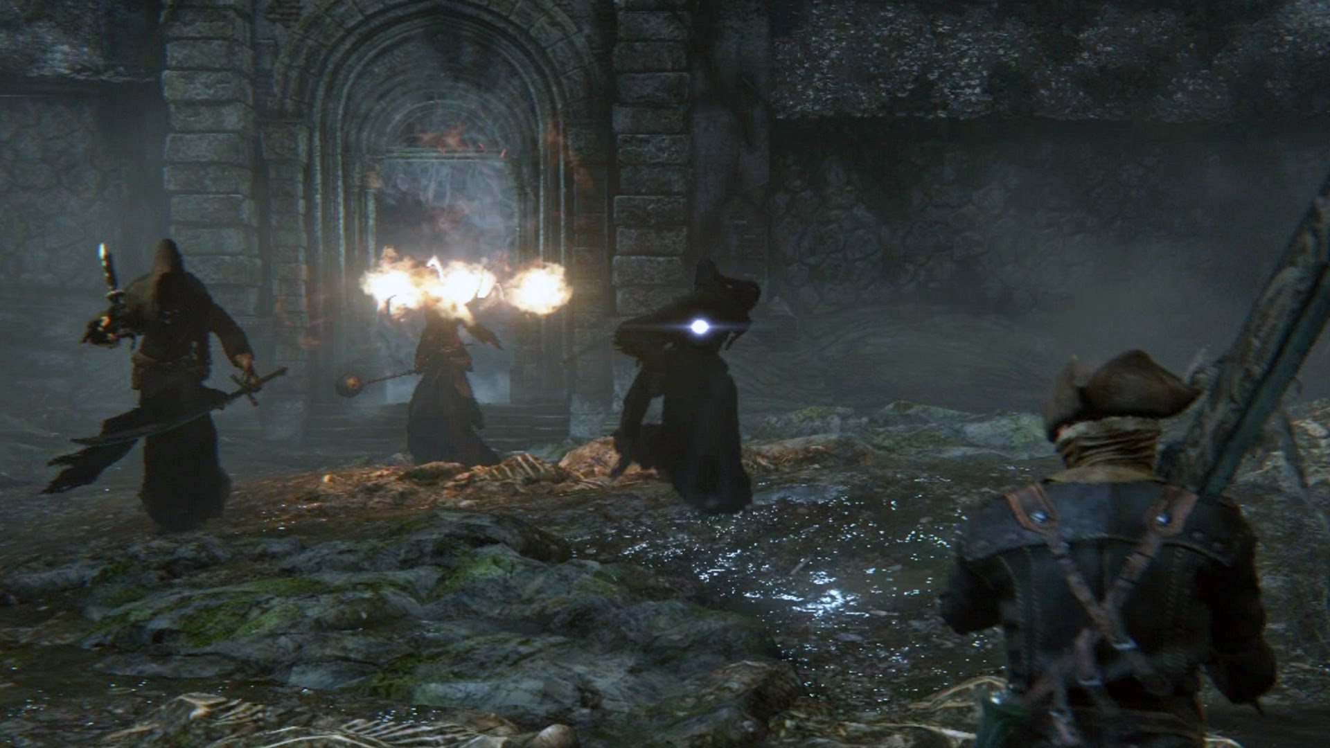 Arguably the first truly tough boss on this list is the Shadow of Yharnam. Or, as you find out when you enter the arena, the Shadows of Yharnam, because there's three of the hooded figures, each with different ways to slice and dice you with various weapons.
