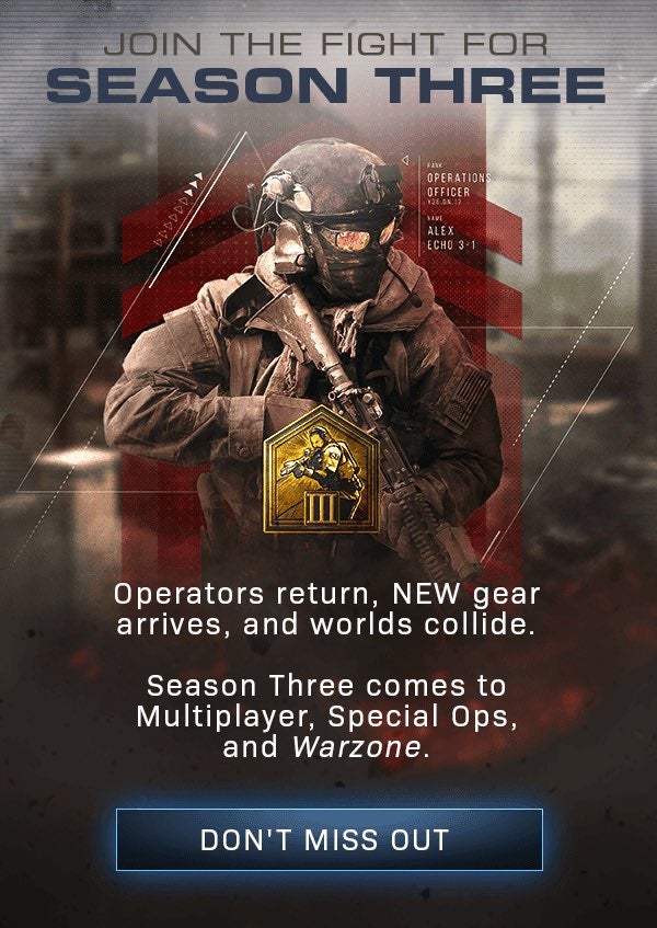 The promo email also confirms new content for multiplayer, Warzone and Spec Ops. It doesn't say what's coming, of course, but it's interesting that all three are specifically mentioned. Season 2 did not bring any new Spec Ops content, for instance.