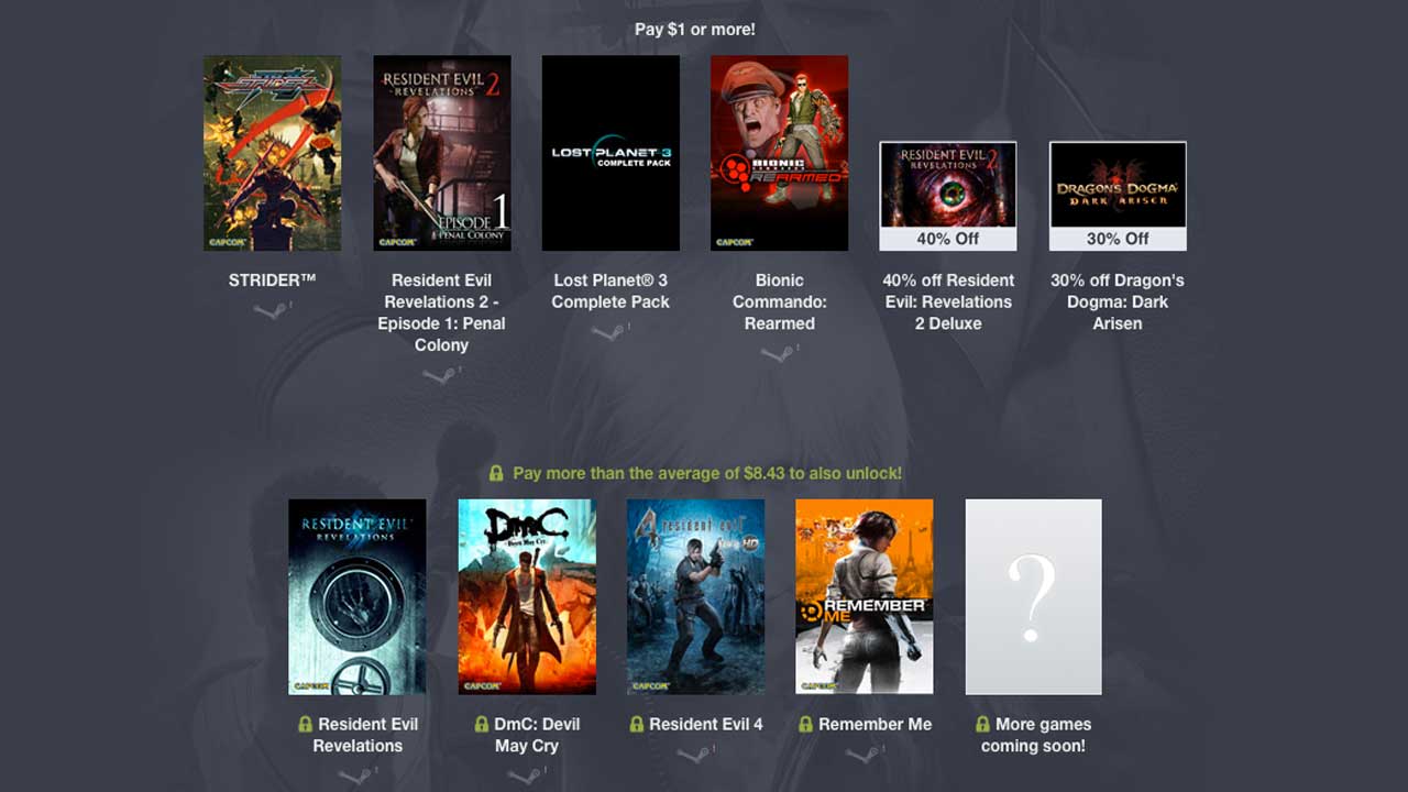 Beat the average ($8.43 at time of writing) to also receive Resident Evil Revelations Revelations, DmC: Devil May Cry, Resident Evil 4 and Remember Me. More games will be added to this tier down the track.
