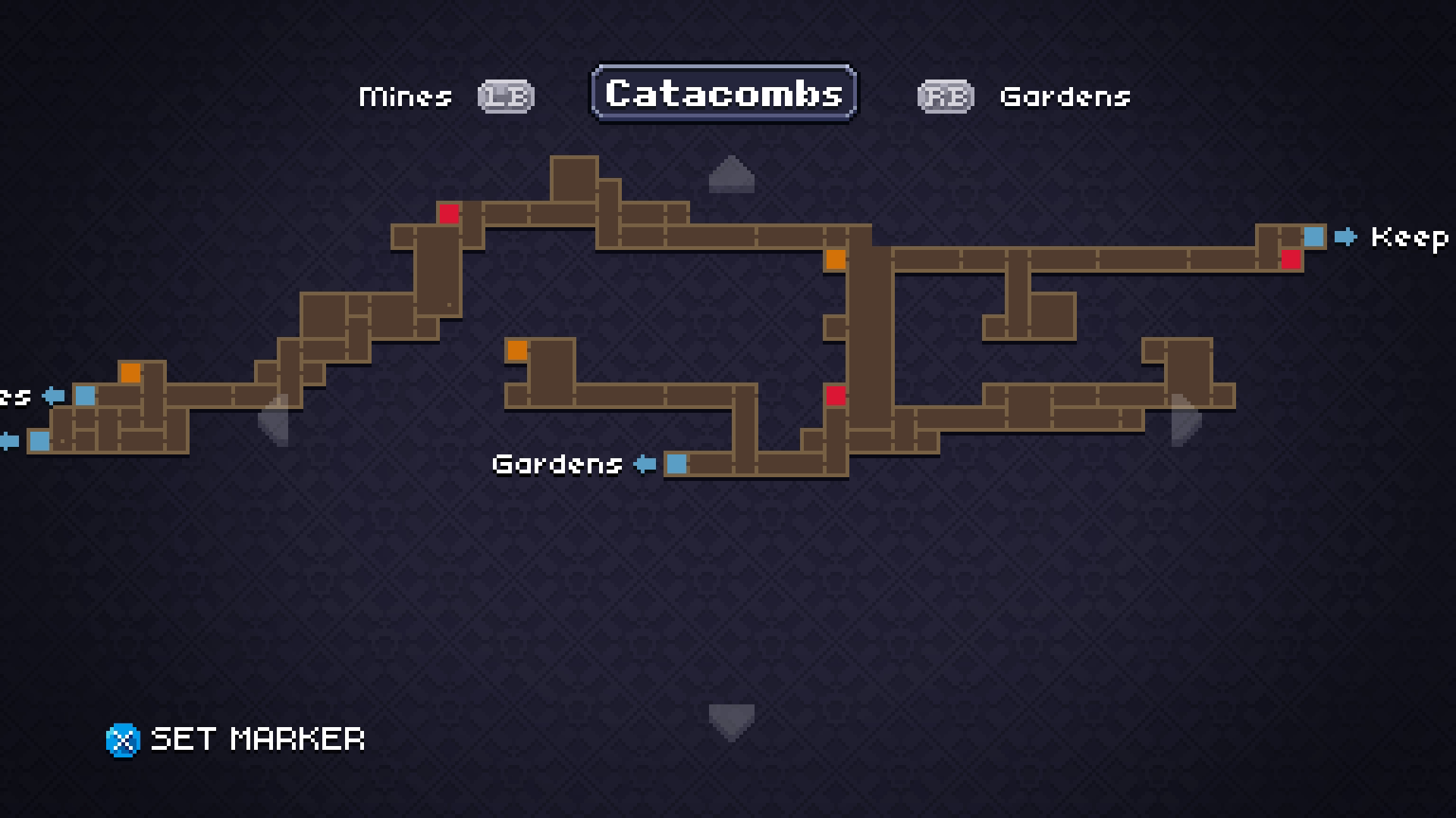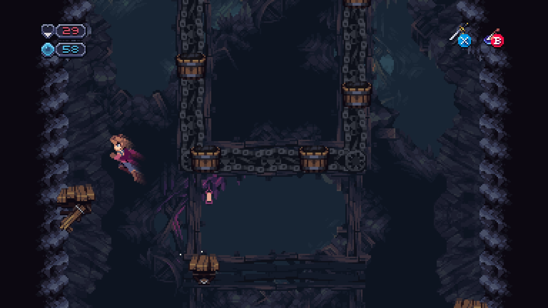 For example, the Climbing Gear is Chasm's version of the wall jump, allowing you to slide down a wall and bounce off parallel walls to scale mineshafts. Once you find the Shin Guards, you can hit down and the jump button to slide through thin passages. The Lantern lights your way forward in rooms without their own light sources. Each Artifact is pretty straightforward and combined with the static map, finding one will have you going, "Oh, I need to use this at that room back in the Gardens," even if you don't remember exactly which room it is. It makes Chasm feel like the entire map is hand-crafted, even if each new playthrough is different.