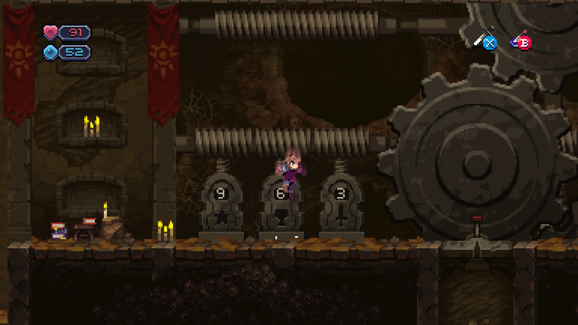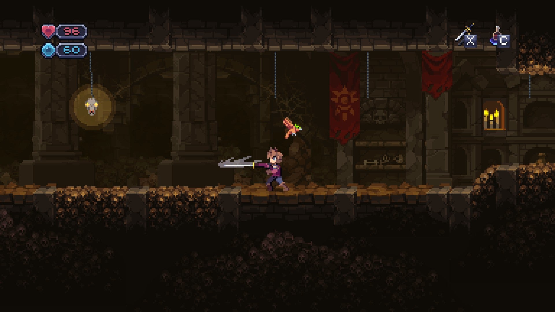 The influence feels stronger than just the sub-weapons though. Some of the Main Hand weapons look and feel like Alucard's melee weapons from Symphony of the Night. Your character leaves afterimages when he jumps and comes complete with a handy backdash and low-diagonal attack. There's a hat that gives you a tiny bird that will occasionally attack enemies, not unlike the Bat Familiar in Symphony of the Night. The levels themselves are also full of handy destructible light sources that drop bags of gold and previous MP. All in all, Chasm feels closer to the Castlevania games that inspired it than some of its indie competitors.