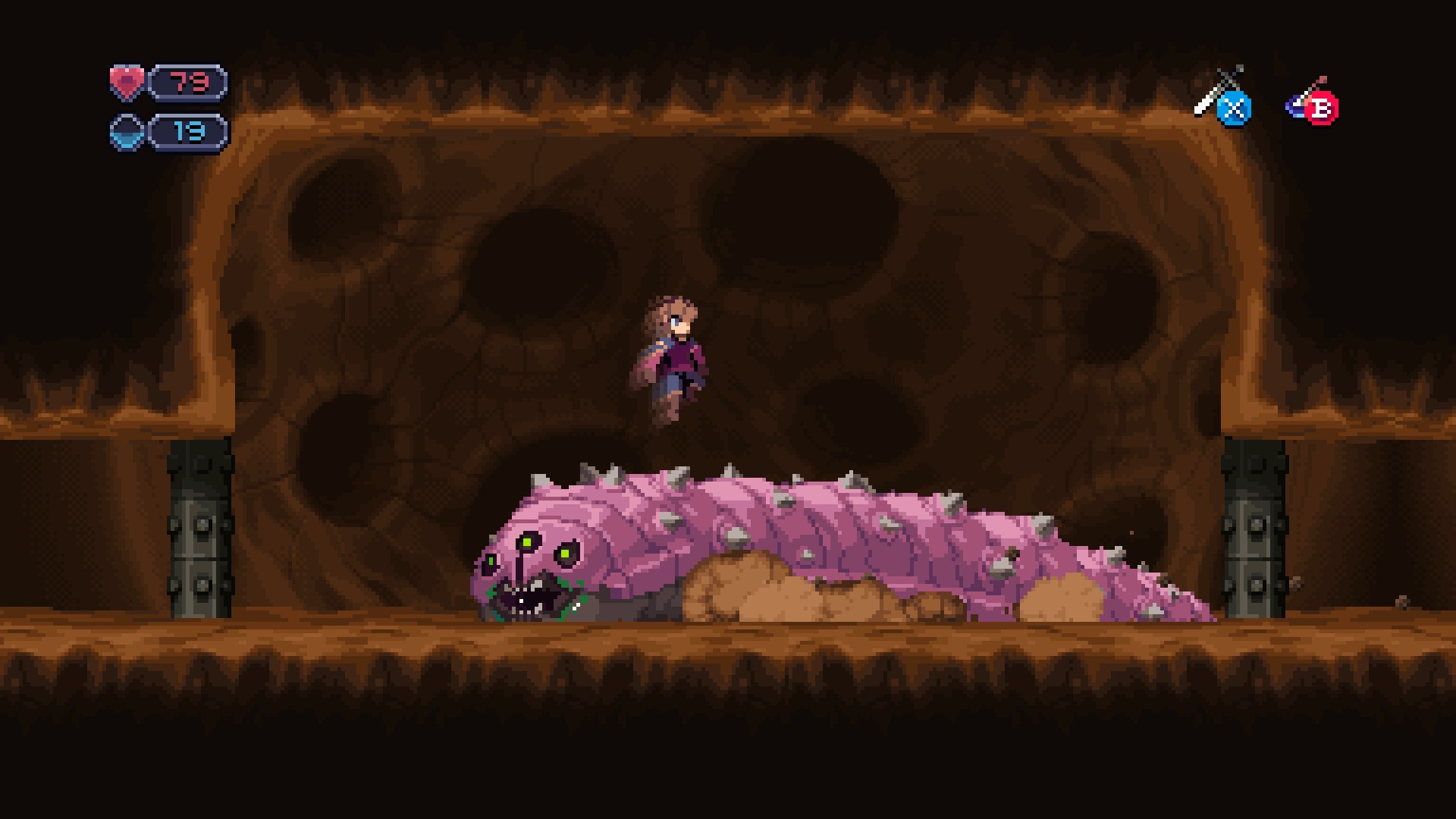 Another point of divergence from the previously-mentioned indie Metroidvanias is the focus on traversal, not combat. There is combat in Chasm, with a ton of enemies, mid-bosses, and bosses gating certain areas, but it's clear that the game was designed to challenge players more in terms of getting around. You'll run into many rooms with moving platforms, disappearing platforms, traps, timed jumps, and various environmental hazards. Enemies will be placed in such a way to knock you directly back into many of these hazards. Precise platforming is needed more than combat prowess in Chasm.