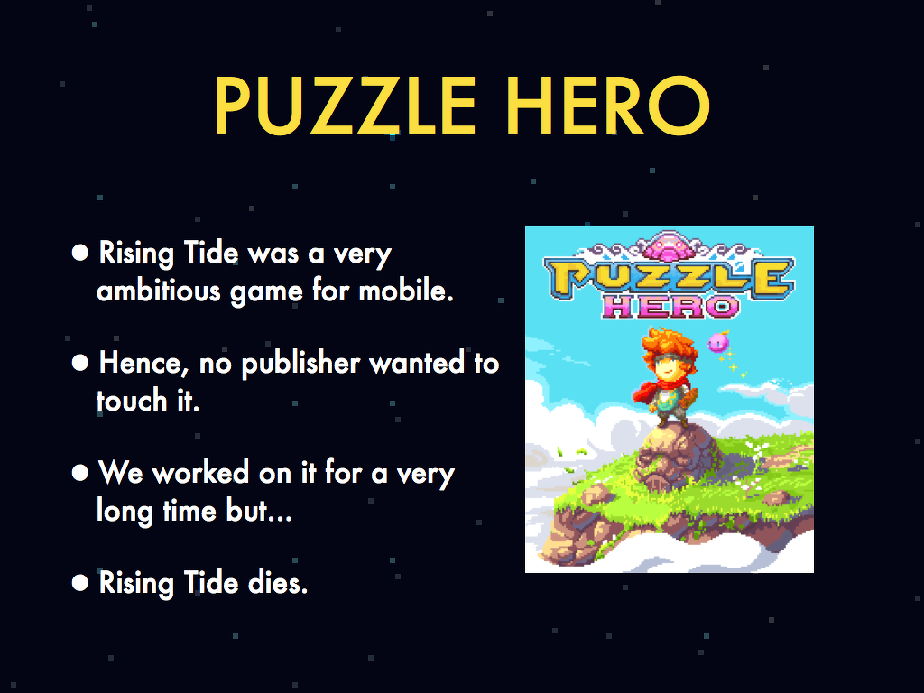 Capybara had a new determination after seeing other indies breaking out with creative titles, including Toronto-based developers like Mare Sheppard (N, N+) and Jonathan Mak (Everyday Shooter). "What we did was decide to try and get Rising Tide off the ground and use what we had which was our 'puzzle expertise' to try and get onto the DS," says Piotrowski.