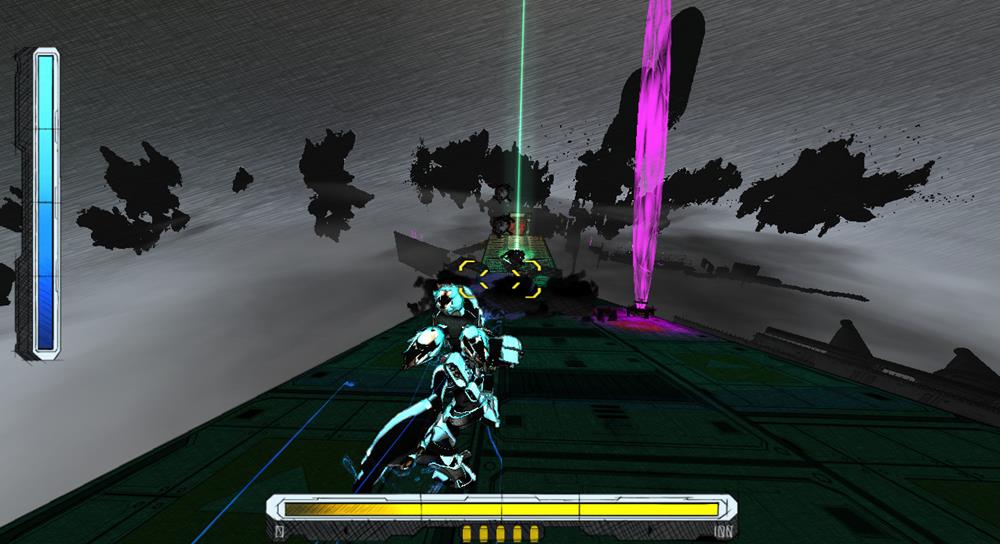 There's no combo system to speak of as such, but you will find yourself chaining jumps and wall manoeuvres to find the best route through stages over and over until you nail that perfect run. This also means you'll be dying a lot, which isn't helped along by a shortage of checkpoints in each stage. Even when you're not trying to complete a decent time on a stage, you'll still find yourself killed often and - at times - inexplicably as a wall boost fails to connect, or you get blind-sided by a floating laser drone shooting you from out of view.