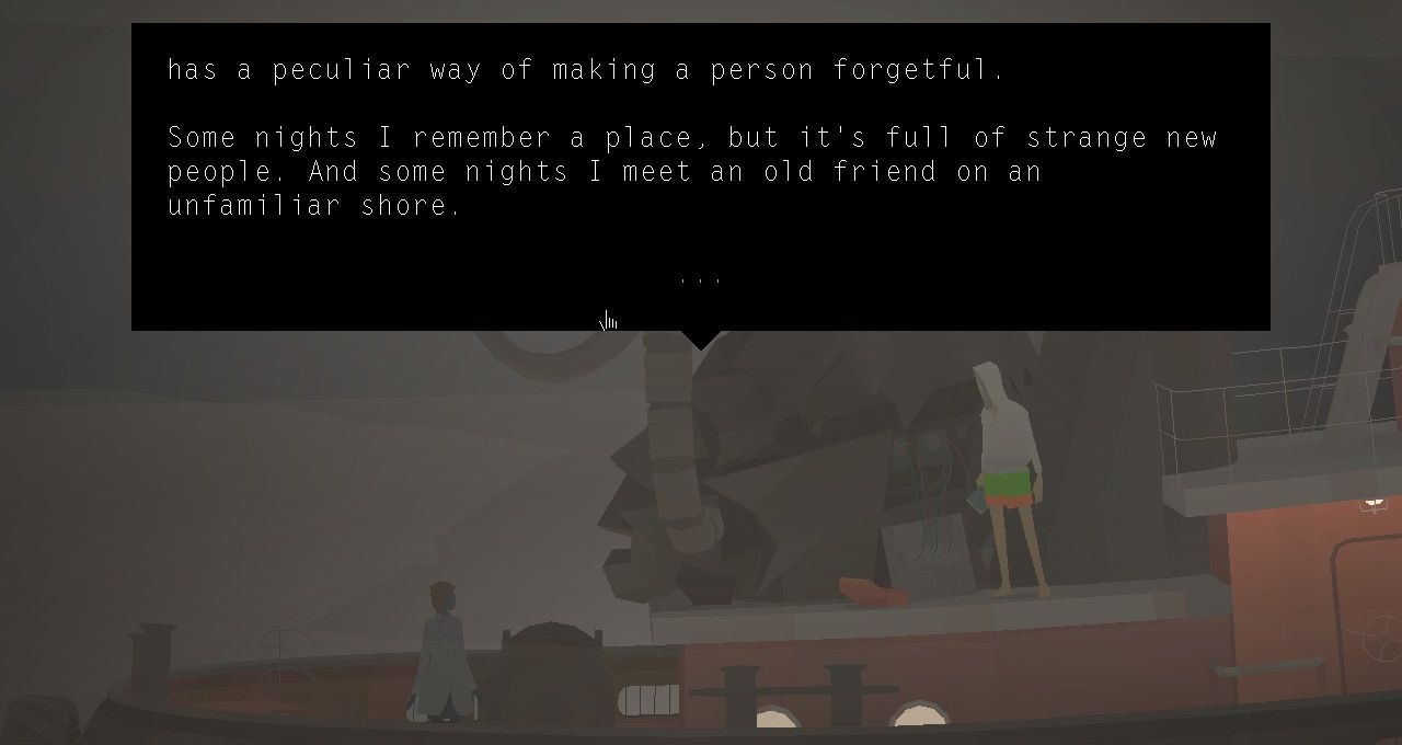 But really, it's what Kentucky Route Zero has always done by letting you explore the contours of conversation as a vital lifeline of human connection. It's a game about talking to each other about your lives and how they converge and diverge. It's a game about examining your place in life and the joy and melancholy of the discovery. Kentucky Route Zero is a game about conversations, and often features diverging conversation threads that you can go back and explore after your initial playthrough is over. Act IV isn't the strongest of the Acts released, but it nonetheless remains essential playing.