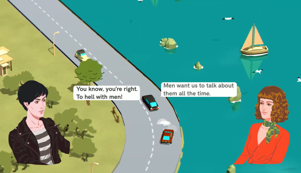 The narrative game that I keep going back to, though, is Wheels of Aurelia, a game that came out of nowhere on my radar and hasn't left yet. You play as Lella, a woman on a road trip across Italy in the 70s who's just picked up another woman, Olga, at a disco. The entire game is you driving your car down the road while you have branching conversations with your passengers, which can include hitchhikers. You can even dismiss Olga at one point in favor of going it alone with whoever else you encounter. The driving is also branching, with different exits leading to a different set of encounters. There's 16 endings in all, and you're going to want to discover them.