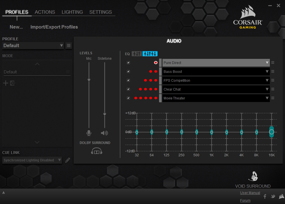 Turning on the virtualized Dolby 7.1 surround isn't as impressive. The dongle and software do the best they can, but the CUE lacks options for changing things like the position and distance of the virtual speakers. You get five equalizer presets and the option to make some further changes in the CUE software, but there should be more choices available.