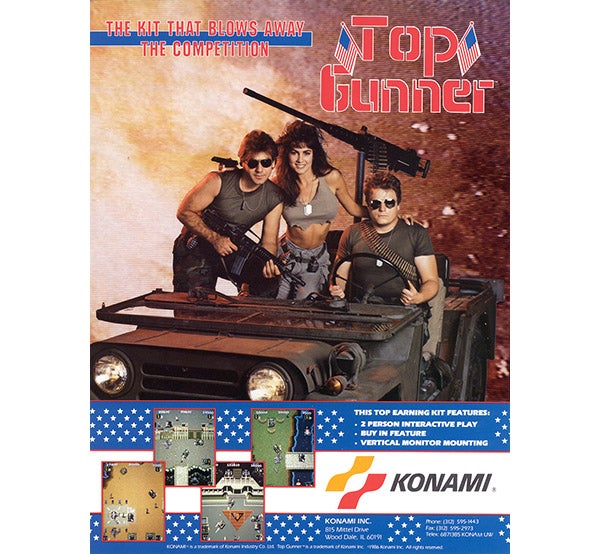Properly speaking, the Contra crop-top actually made its debut in a flyer for Top Gunner, a game that showed up in 1986, a year before Contra. You may never have heard of "Top Gunner," but that's because it's better known by the alternate name they used for its NES release: Jackal. I guess when Konami locked down the legitimate Top Gun license for NES they felt a little embarrassed about their blatant trademark infringement.