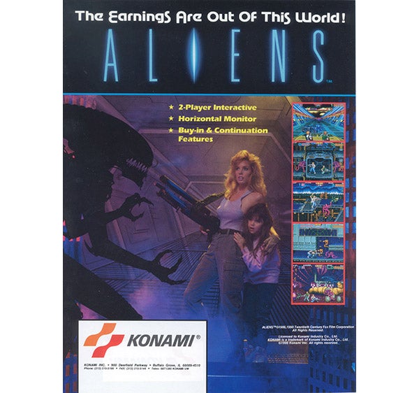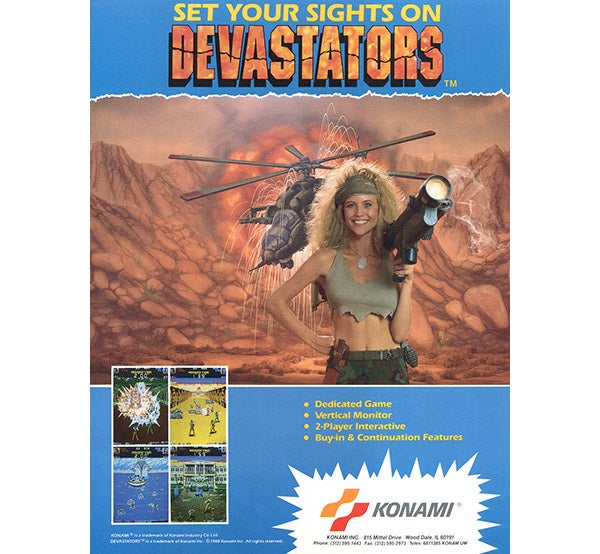 Someone in Konami's marketing department in the '80s evidently decided that selling a brilliant game about tough guys with big guns blowing up slime-covered aliens on its own was too difficult, so they did the car magazine thing and instead sold the game with a cute girl posing by the arcade cabinet. This practice wasn't too far out of the ordinary. Arcade flyers were aimed at distributors and arcade owners, not gamers themselves, so it makes sense that game manufacturers would resort to appealing to what was predominantly a demographic of middle-aged white dudes with young, sexed-up women. It worked for Camaros -- why not Contras, too?