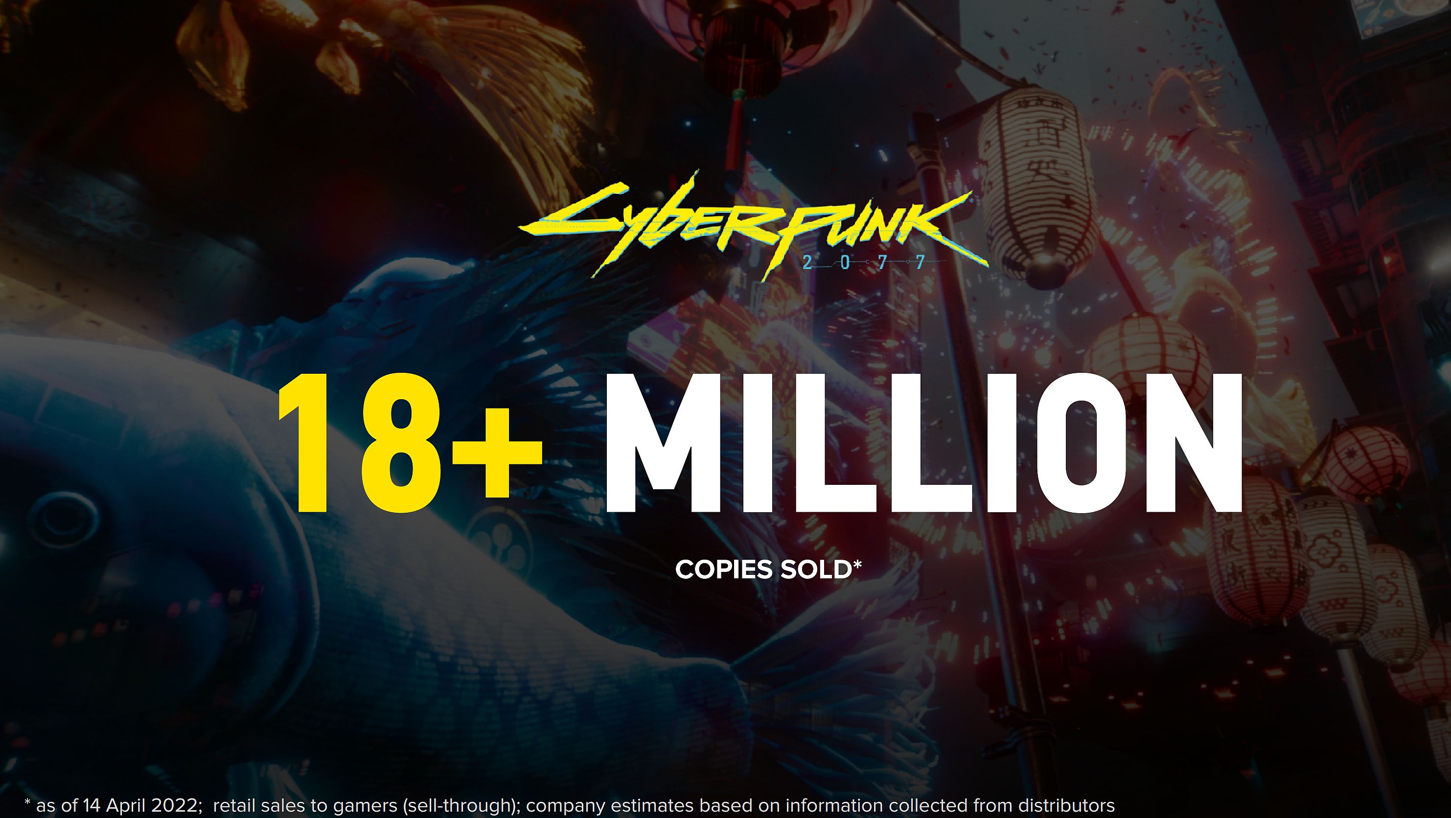 In its latest financial report, CD Projekt announced Cyberpunk 2077 has sold over 18 million copies as of April 14, 2022.