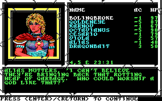 Much of Azure Bonds remained the same as it had been in Pools of Radiance. Exploration played out through a rudimentary first-person perspective similar to that of many earlier RPGs, but combat took place in a more tactical overhead view, like Ultima but better. Players could face massive enemy parties, but by drawing on proper D&D lore they could overcome those nasty odds and triumph as well. Behind the scenes, players could roll up just about any party combination they could imagine, drawing on the full scope of D&D races and classes, the full alignment grid, and even choosing different genders as well.