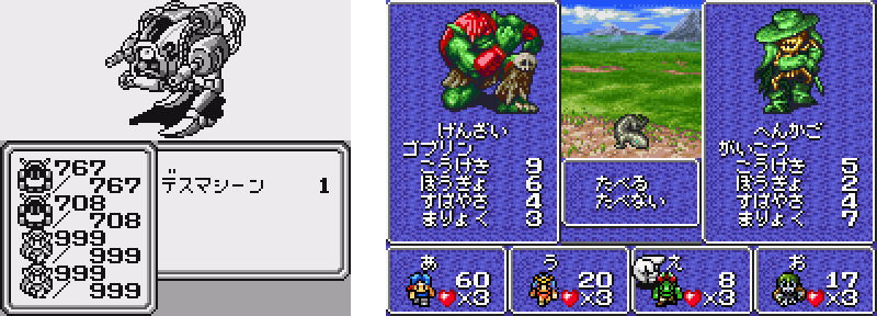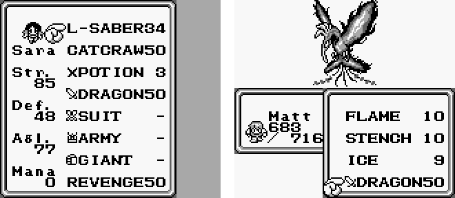 SaGa didn't incorporate the same leveling mechanics as Final Fantasy II, but neither did it walk the straight and narrow of its console RPG brethren. Players could roll their own party of four warriors from three different races: Human, Mutant, and Monster. Each had its own strengths, along with its own specific quirks. Humans had powerful physical stats but would eventually hit a ceiling on stat growth, and could only level up by using permanent consumable items. Mutants (Espers in the Japanese version) could wield powerful magical spells, but they could only memorize a small number of spells at once and there was a decent chance that one of their spells would randomly be replaced by another at the end of a battle. And Monsters demonstrated no stat growth whatsoever; instead, they could devour the meat of fallen enemies to mutate into other forms (sometimes more powerful, sometimes not).