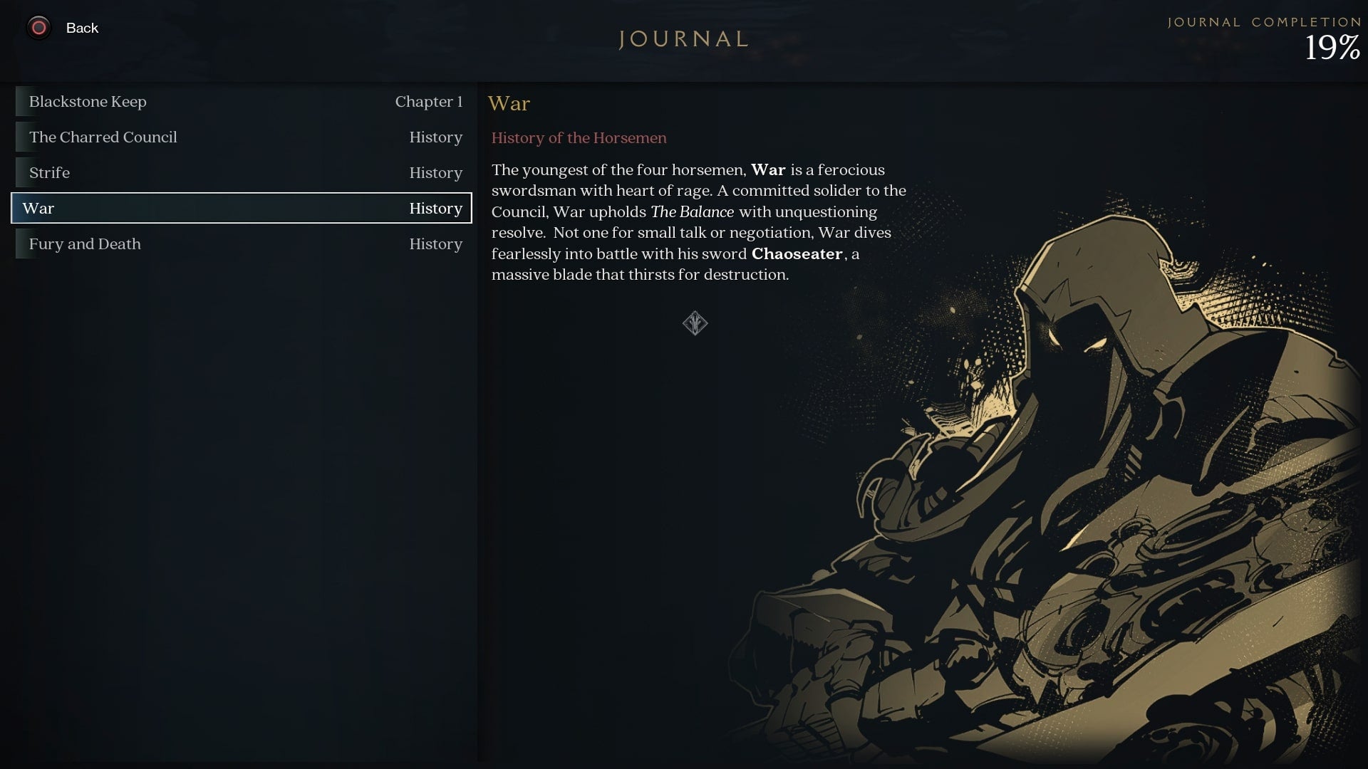 War is the other playable protagonist featured in Darksiders Genesis. He is much more of an up-close and personal fighter when compared to Strife. War is the youngest of the Four Horsemen, and is the main protagonist of the first Darksiders game. In this game, War is being sent to kill Lucifer, who is planning to bring about an end to human kind. War is voiced by Liam O'Brien.