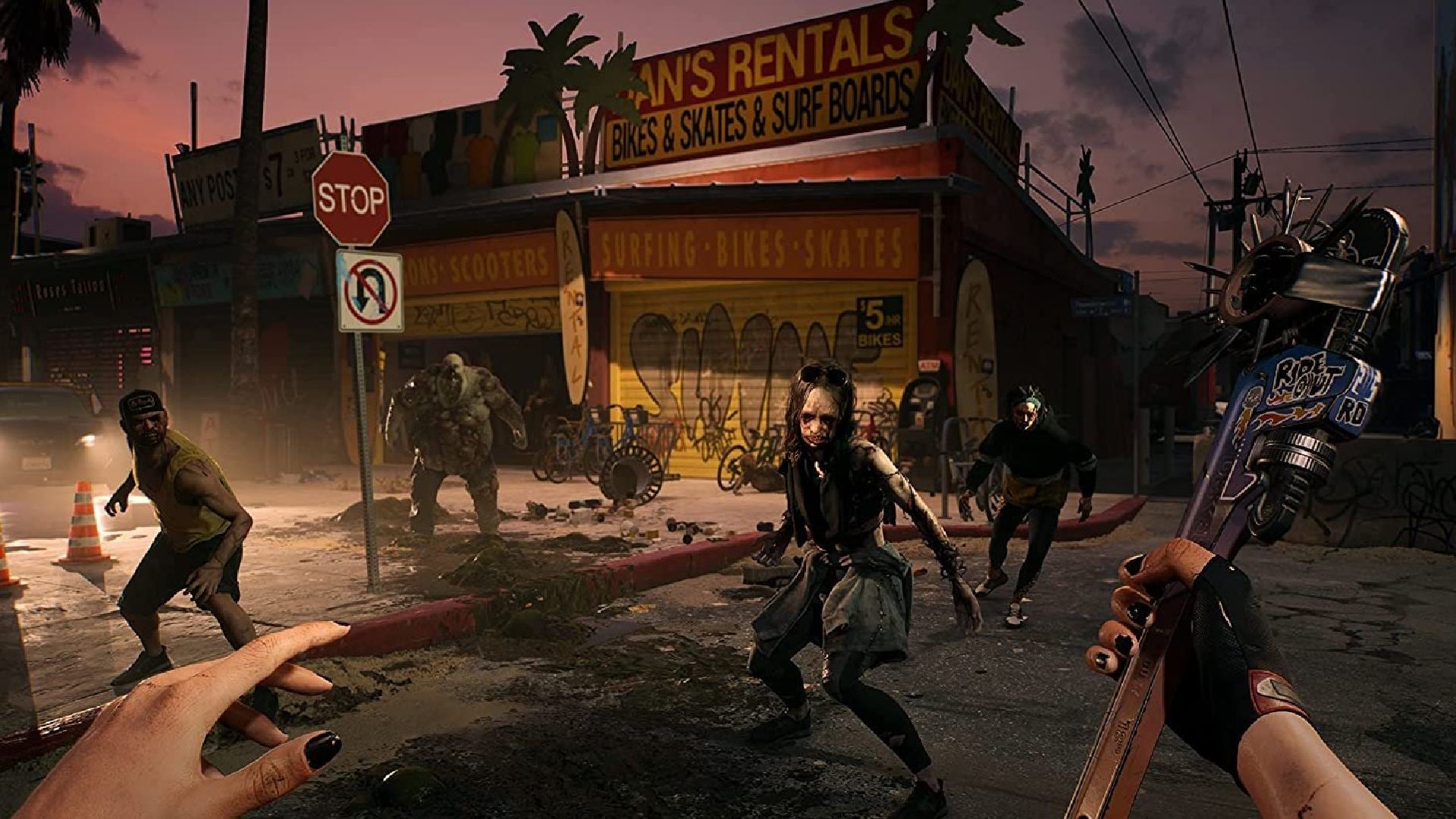 I can tell you now that this isn’t some well-rehearsed PR drivel. Well, it might be, but it’s fair to say because damn this game looks good. Whether it’s the subdued neon lighting in a powered-down arcade softly illuminating the blade of the katana you’re holding close to your body, or the fire licking out of an axe and crisping up the skin of a zombie whose head you’ve just had a pop at, Dead Island 2 is a ravishing feast for the eyes.