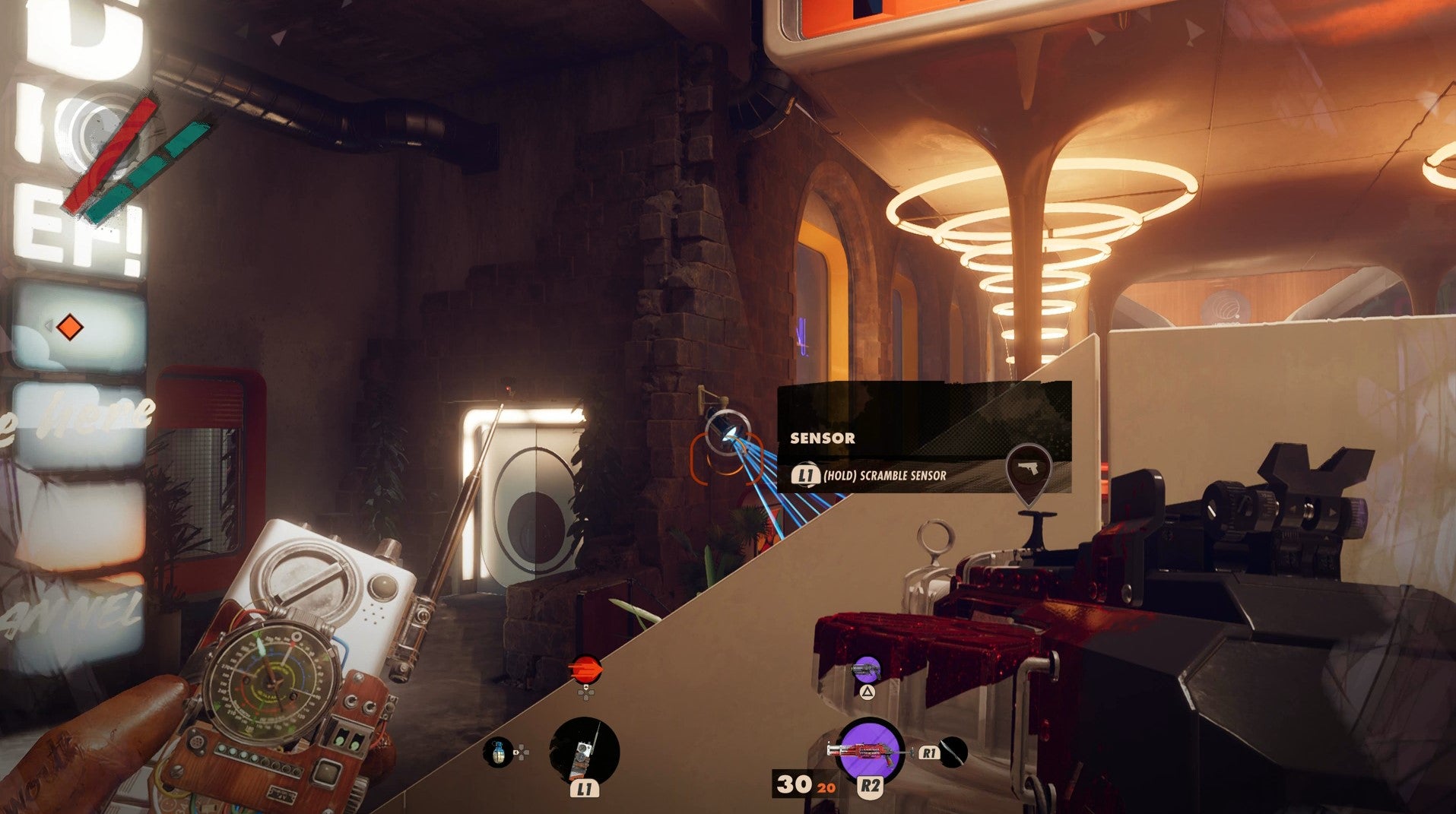 There’s a door here that you can get through, then Shift through the lasers, hack the couple of cameras, then destroy the generator down the stairs to your right.